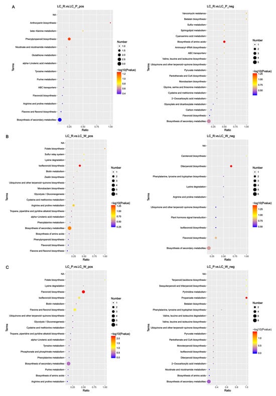 KEGG enrichment bubble diagram (positive ion mode on the left, negative ion mode on the right). (A) The KEGG pathway analysis of DEGs in LC_ vs. LC_P. (B) The KEGG pathway analysis of DEGs in LC_R vs. LC_W. (C) The KEGG pathway analysis of DEGs in LC_P vs. LC_W.