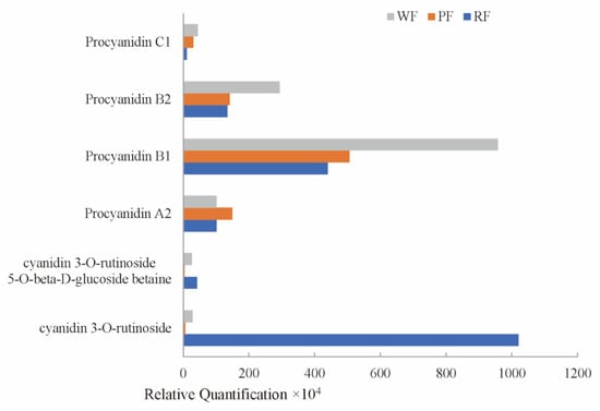 Quantitative analysis was performed on the identified metabolites to determine differences between groups, with comparisons based on fold-change and p-values. For F. pentaphylla, keracyanin content was the highest in red fruits (RF), which was 170-fold and 35-fold higher than that in pink fruits (PF) and white fruits (WF), respectively (Table 2 and Figure 4). The highest levels of procyanidin B1 and procyanidin B2 were detected in WF, which were approximately 2-fold higher than those in RF and PF. In addition, RF had the highest prunin content, being 4-fold and 76-fold higher than that in PF and WF, respectively. Catechin content was highest in WF, followed by PF, with RF showing the lowest content. Levels of taxifolin, quercetin, and apiin were nearly identical in RF and WF, while the highest levels of these three metabolites were observed in PF. Myricetin content was highest in WF, which was 3- to 4-fold higher than that in RF and PF, respectively.