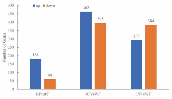Total RNA was isolated following the manufacturer’s instructions using Trizol reagent (Invitrogen, Carlsbad, CA, USA). The quantity and purity of the RNA were evaluated with an Agilent 2100 Bioanalyzer and the RNA 6000 Nano LabChip Kit (Agilent Technologies, Santa Clara, CA, USA). Samples with an RNA Integrity Number (RIN) of 7.0 or above were selected for subsequent analysis. mRNA was then enriched using Oligo(dT) (Thermo Fisher, San Diego, CA, USA) beads and broken into smaller fragments with a fragmentation buffer. Reverse transcription of these fragments was carried out with random primers, and second-strand cDNA synthesis was performed using a buffer, deoxynucleoside triphosphates, RNase H, and DNA Polymerase I. The resulting cDNA fragments were purified with AMPure XP beads [23]. Then, AMPure XP beads were used for fragment selection, and PCR amplification was carried out to generate the final sequencing library. In total, nine libraries were prepared from PCR-amplified cDNA, with three biological replicates each, labeled as RF1, RF2, RF3, PF1, PF2, PF3, WF1, WF2, and WF3, for subsequent RNA-seq analysis. The RNA-Seq libraries were assembled and analyzed on the Illumina Novaseq 6000 platform (LC-Bio Technology Co., Ltd., Hangzhou, China) by LC BIO.