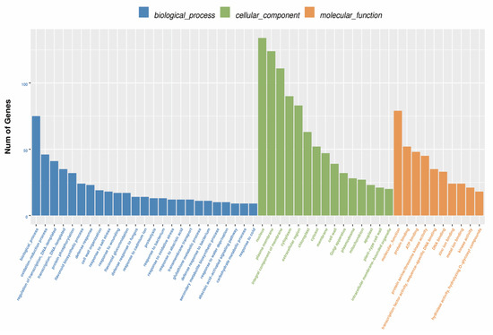 According to annotations from the GO database, 18,834 genes mapped to 926 GO terms, with 3646 genes identified as differentially expressed. The GO comprises three ontologies describing molecular function, cellular component, and biological process, encompassing 50 function-related subcategories (Figure 6). A total of 1409 differentially expressed genes were annotated to biological processes, categorized into 25 subclasses; 1151 differentially expressed genes were annotated to cellular components, classified into 15 subclasses; and 1086 differentially expressed genes were annotated to molecular functions, categorized into 10 subclasses.