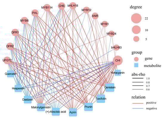 Pearson correlation coefficients were computed to analyze the relationships between metabolites and differentially expressed genes (DEGs) involved in anthocyanin biosynthesis. Relationships with a correlation coefficient (r) greater than 0.6 or less than −0.6 were deemed significant for linking the metabolome and transcriptome. Correlation network analysis was conducted using Cytoscape 3.9.1 to visualize these specific associations.