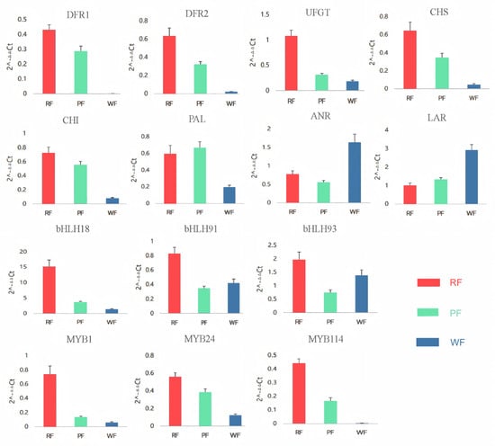 A total of 14 node DEGs expressions were detected in the fruits of three different colors: red, pink, and white (Figure 8). Based on the qRT-PCR results of 14 genes, their expression patterns can be categorized into three types. The structural genes included FpDFR1, FpDFR2, FpUFGT, FpCHS, and FpCHI; their expression levels were highest in RF, followed by PF. They showed a positive correlation between gene expression and anthocyanin accumulation. The structural genes included FpANR and FpLAR; their expression level in WF was higher than in RF and PF fruits. The structural gene FpPAL was highest in PF, followed by RF. The bHLH TFs included FpbHLH18, FpbHLH91, and FpbHLH93; their expressions were highest in RF. However, the expression levels of FpbHLH91 and FpbHLH93 in WF were higher than in PF. The expression level of FpbHLH18 was the lowest in WF. The MYB TFs included FpMYB1, FpMYB24, and FpMYB114; their expressions were highest in RF and were lowest in WF.