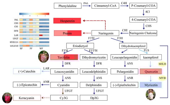 A pathway diagram was created based on the detailed anthocyanin biosynthesis pathway, including a heatmap showing the expression of each structural gene involved in anthocyanin production in F. pentaphylla (Figure 9). Transcript levels of key structural gene families, including CHS, CHI, DFR, and UFGT, were higher in RF than in PF and WF, consistent with the elevated anthocyanin accumulation and fruit color variation. Compared with PF and WF, the PAL gene demonstrated a marked increase in expression in RF. Conversely, one LAR gene exhibited a marked decrease in expression in RF and PF compared to WF. The majority of MYB and bHLH transcription factors (TFs) demonstrated an increase in expression in RF. The differential accumulation of metabolites in the flavonoid biosynthetic pathway included keracyanin, hesperetin, prunin, and taxifolin (upregulated in RF), quercetin (upregulated in PF), and myricetin (upregulated in WF). Genes involved in flavonoid and anthocyanidin biosynthesis play critical roles, and MYB and bHLH transcription factors regulate structural genes to promote anthocyanin formation. The differential accumulation of these metabolites contributes to the observed variation in fruit coloration, manifesting as red, pink, or white hues.