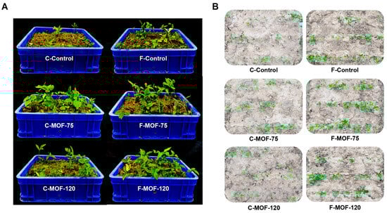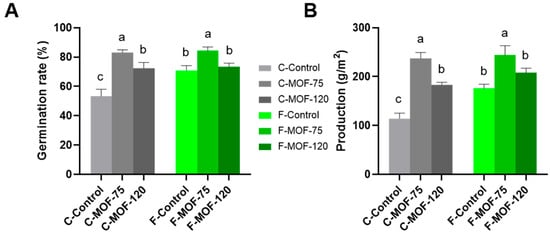 After a two-month treatment, P. ternata grown in both greenhouse and field conditions at 75 and 120 g/m2 MOF displayed a significantly higher germination rate and vigor in comparison to controls, with a stronger effect when 75 g/m2 MOF was used (Figure 1A,B).