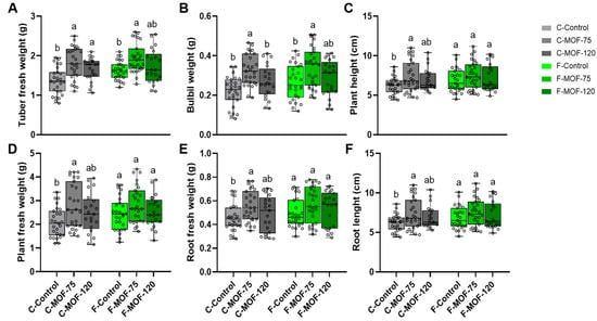 Moreover, MOF-treated at 75 g/m2 caused a significant increase in germination rate and yield (Figure 2). In particular, the application of MOF at 75 g/m2 in continuous cropping soils resulted in a 2-fold increase in yield, reaching to 237 g/m2, with a comparable effect to that observed when the same MOF was applied to first cropping soil of P. ternata, where the yield was 244 g/m2. This suggests that it has great potential as an effective strategy for alleviating the negative impacts of continuous cropping on soil productivity and plant performance. This effect was also detected in other agronomic traits in continuous cropping soils after MOF supply, including tuber and bulbil weight, plant height, plant fresh weight, root fresh weight, and root length (Figure 3). The most significant increase was observed in the weight of bulbils. In the continuous cropping soils, the weight of the bulbils ranged from 0.08 g to 0.34 g, while after treatment with 75 g/m2 MOF, the range increased to 0.19–0.47 g. For the first cropping soil, the weight of the bulbils was 0.12–0.43 g, and with MOF treatment, it ranged from 0.19–0.51 g (Figure 3B). However, MOF application had a minor effect on the P. ternata agronomic traits in first cropping soils, with an increase of up to 1.2-fold and 1.3-fold in tuber and bulbil weights mainly due to 75 g/m2 treatment (Figure 3A,B).