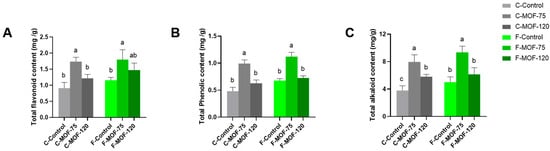 The metabolite content in medicinal plants is crucial due to its direct impact on their therapeutic efficacy compared to other plants. As indicators of quality, the secondary metabolites of tuber, including total phenols, flavonoids, and total alkaloid were determined. All of them significantly increased at 75 g/m2 MOF under both soil conditions; while 120 g/m2 MOF had no such effect, only total alkaloid content was slightly increased after 120 g/m2 MOF applied in continuous cropping soils condition. Total phenols, flavonoids, and total alkaloids increased by 2.1-fold, 1.91-fold, and 2.09-fold in continuous cropping soils, respectively, and by 1.65-fold, 1.57-fold, and 1.87-fold in first cropping soil (Figure 4). These results indicated that the optimal rate of MOF was 75 g/m2, as both yield and quality were enhanced when this dose was applied to P. ternata.