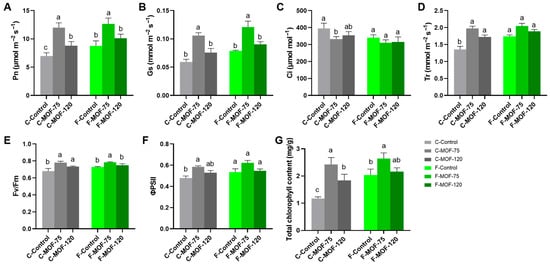 Effect of microbial organic fertilizer application on photosynthetic indexes, photochemical efficiency, and chlorophyll content of P. ternata in field experiments (A): Pn, net photosynthetic rate, (B): Gs, stomatal conductance, (C): Ci, intercellular CO2 concentration, (D): Tr, transpiration rate, (E): Fv/Fm, maximum photochemical efficiency of PSII, (F): ΦPSII, quantum yield, (G): total chlorophyll content. Data are given as mean ± SE (n = 3). Lowercase letters represent significant difference among samples in each soil condition using one-way ANOVA (p < 0.05) followed by a Tukey HSD post-hoc test (p < 0.05).