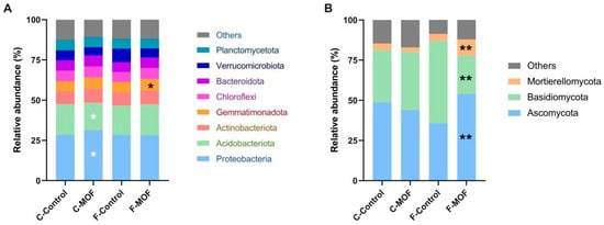 Effect of microbial organic fertilizer application on the relative abundance of bacteria and fungi in the rhizosphere soil of P. ternata at the phylum level. (A) bacterial phyla, (B) fungi phyla. Statistical significance was analyzed by Student’s t-test. Black asterisks of * and ** indicate significant differences at p < 0.05 and p < 0.01 in relative abundance between F-Control and F-MOF, white asterisks represent significant difference at p < 0.05 in relative abundance between C-Control and C-MOF. C-Control: Planting in continuous 2-year cropping soils of P. ternata. C-MOF: Application of microbial organic fertilizer in continuous 2-year cropping soils with a concentration of 75 g/m2. F-Control: Planted in the soil of the first planting of P. ternata. F-MOF: Application of microbial organic fertilizer in first planting soils with a concentration of 75 g/m2.