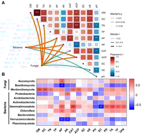 Relationship between soil properties and microbial abundance. (A) The relationships of the physicochemical factors with bacteria and fungi were obtained by the Mantel test. The color gradient and the squares represent the Pearson correlation coefficient. The relationships of the physicochemical factors with bacteria and fungi were obtained by Mantel test. The width of the curve represents Mantel’s r statistic for the correlation coefficient (R), and the color represents the type of association. (B) The Pearson correlation between various microbial and soil properties. *, ** and *** indicate significant differences at p < 0.05, p < 0.01 and p < 0.001, respectively.
