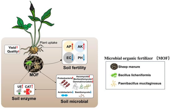 Soil physicochemical properties serve as indicators of soil quality, reflecting the ability of soil to maintain environmental quality and promote plant productivity [41]. Bacillus licheniformis and Bacillus mucilaginosus, known for their safety, are used in commercial probiotics and have been widely applied in many plants, including tomato, rice, and wheat [39,40,42]. Here, we selected one commonly used MOF containing Bacillus licheniformis and Bacillus mucilaginosus to test its effect on P. ternata growth and soil quality. Our results demonstrated that applying appropriate MOF significantly increased the content of AP and AK while reducing soil pH and EC in both soil types (Table 2), and one possible reason for these improvements is that MOF contain active Bacillus spores. It was noted that the experimental site was located in the north of Anhui providence, China, which is a typical saline–alkali type land. Our results showed that applying MOF led to a decrease in pH value. This reduction occurred because the bacteria produced pyruvate, which was then converted into organic acids such as lactic acid and acetic acid, thereby decreasing soil acidity [18].