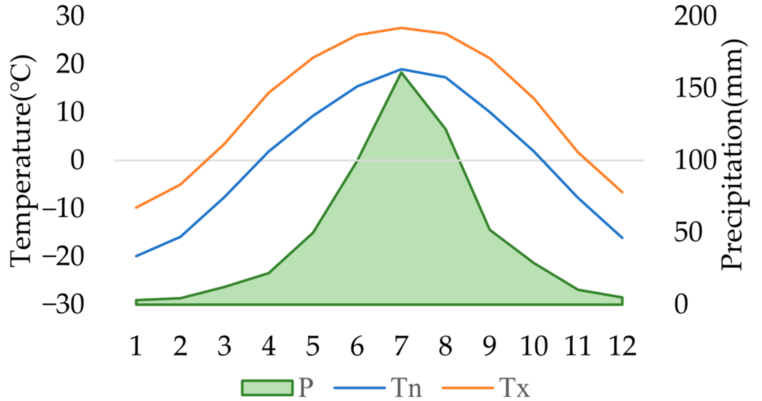 S. chinensis at Jilin Agricultural University in Changchun City, Jilin Province (43°48′05″ N, 125°24′15″ E). The garden’s soil is classified as chestnut soil, and the region experiences a temperate continental monsoon climate. The lowest temperature appeared at 19.9 °C in January, the highest rainfall is up to 161.1 mm in July (