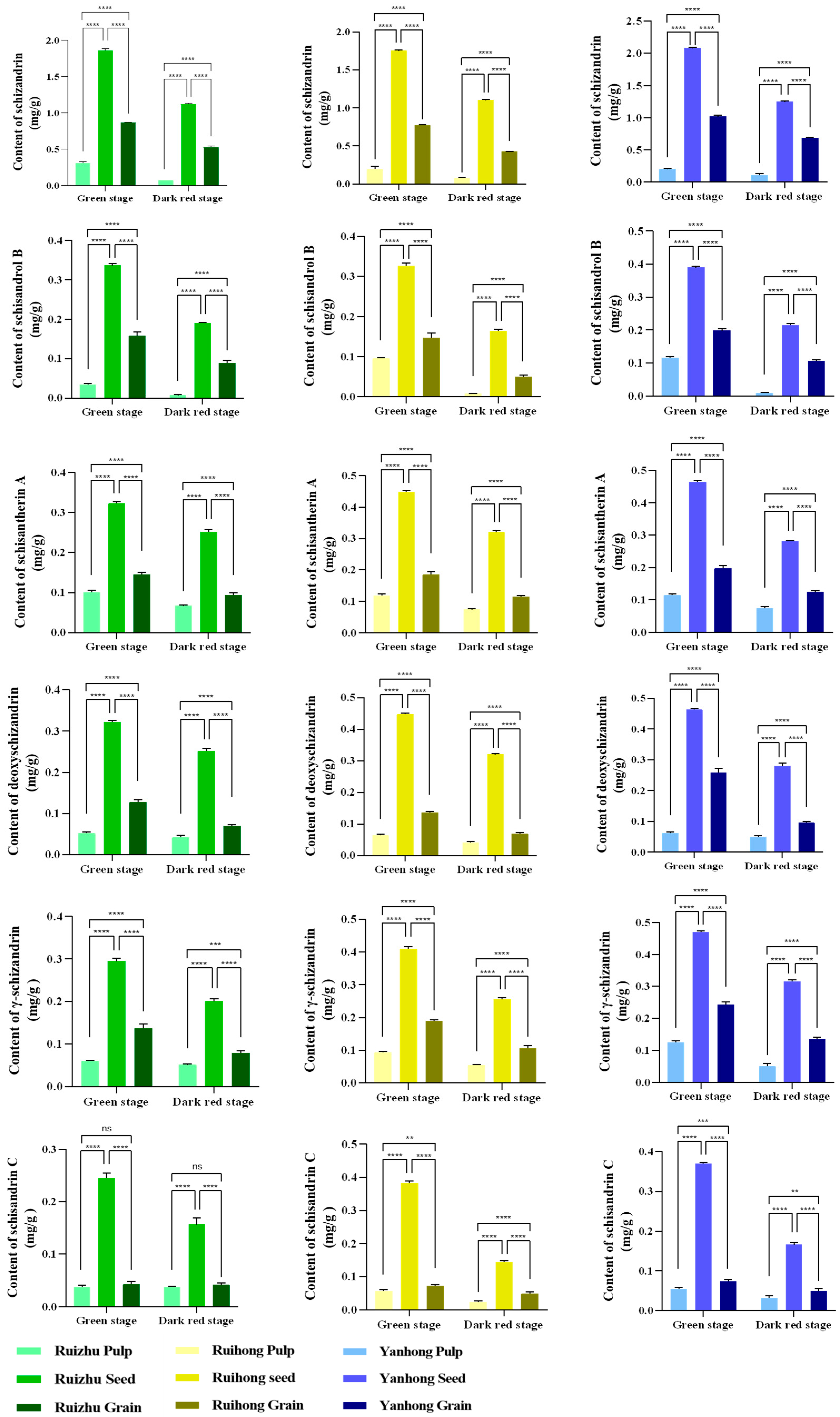 Plants at two stages of maturity (green stage and dark red stage) were randomly selected to determine the contents of six lignans (schisandrin, schisandrol B, schisantherin A, deoxyschizandrin, γ-schisandrin, and schisandrin C) in the grains, seeds, and pulp of the three