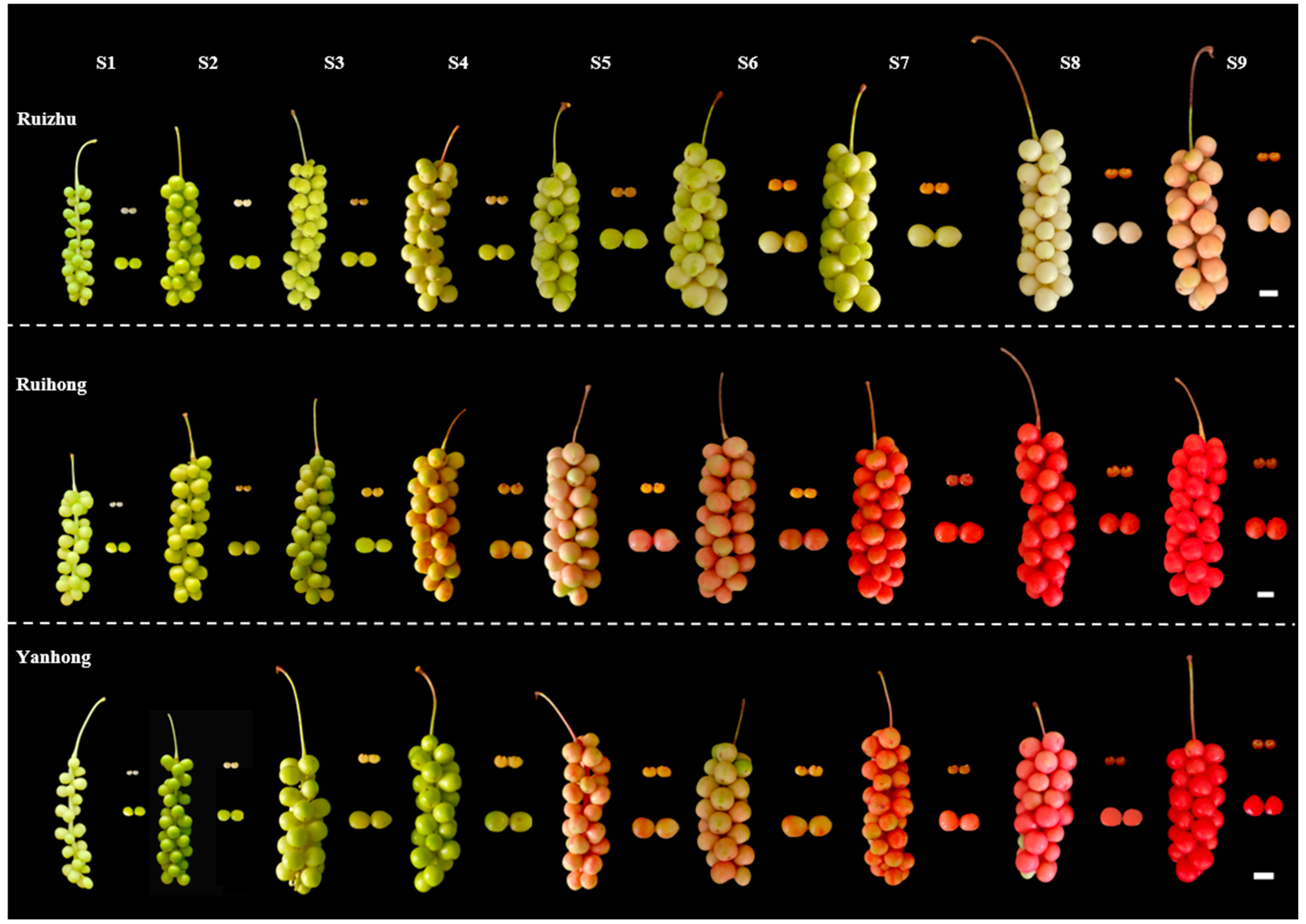 Figure 3). However, the shape of the seeds did not change significantly during development. The flesh of Ruizhu grains was yellow-white when mature but then began to change to yellow-green at 70 days after flowering (S4) and tended to revert to yellow-white by 104 days after flowering (S8), indicating the mature stage. The grains of Ruihong and Yanhong were red at maturity. The flesh of Ruihong started to exhibit green and slight red hues at 70 days after flowering (S4), while Yanhong only exhibited this coloration at 80 days after flowering (S5). Both varieties turned red at 97 days after flowering (S7) and turned dark red at 111 days after flowering (S9), marking the maturity of the grains.