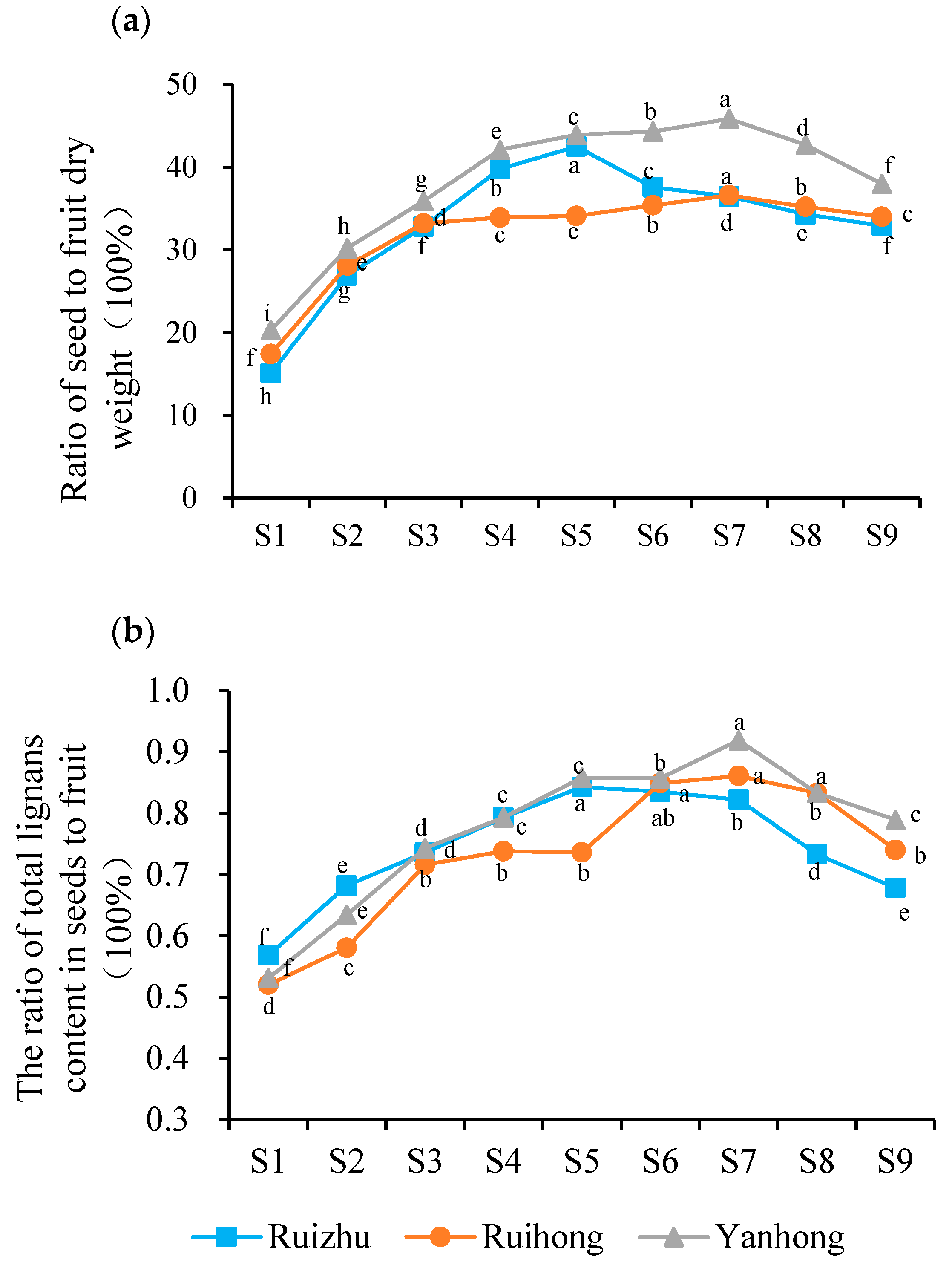 Figure 4b), was proportional to the changes in the seed-to-grain dry weight ratio. The ratio of the total lignans content in the Ruizhu seed and grains increased from 25 to 90 days after flowering (S1–S5). Ruihong and Yanhong reached their maximum ratios at 97 days after flowering (S7). The ratio of the total lignans content in Yanhong seeds and grains peaked at 91.9%, marking the period with the highest lignans content in