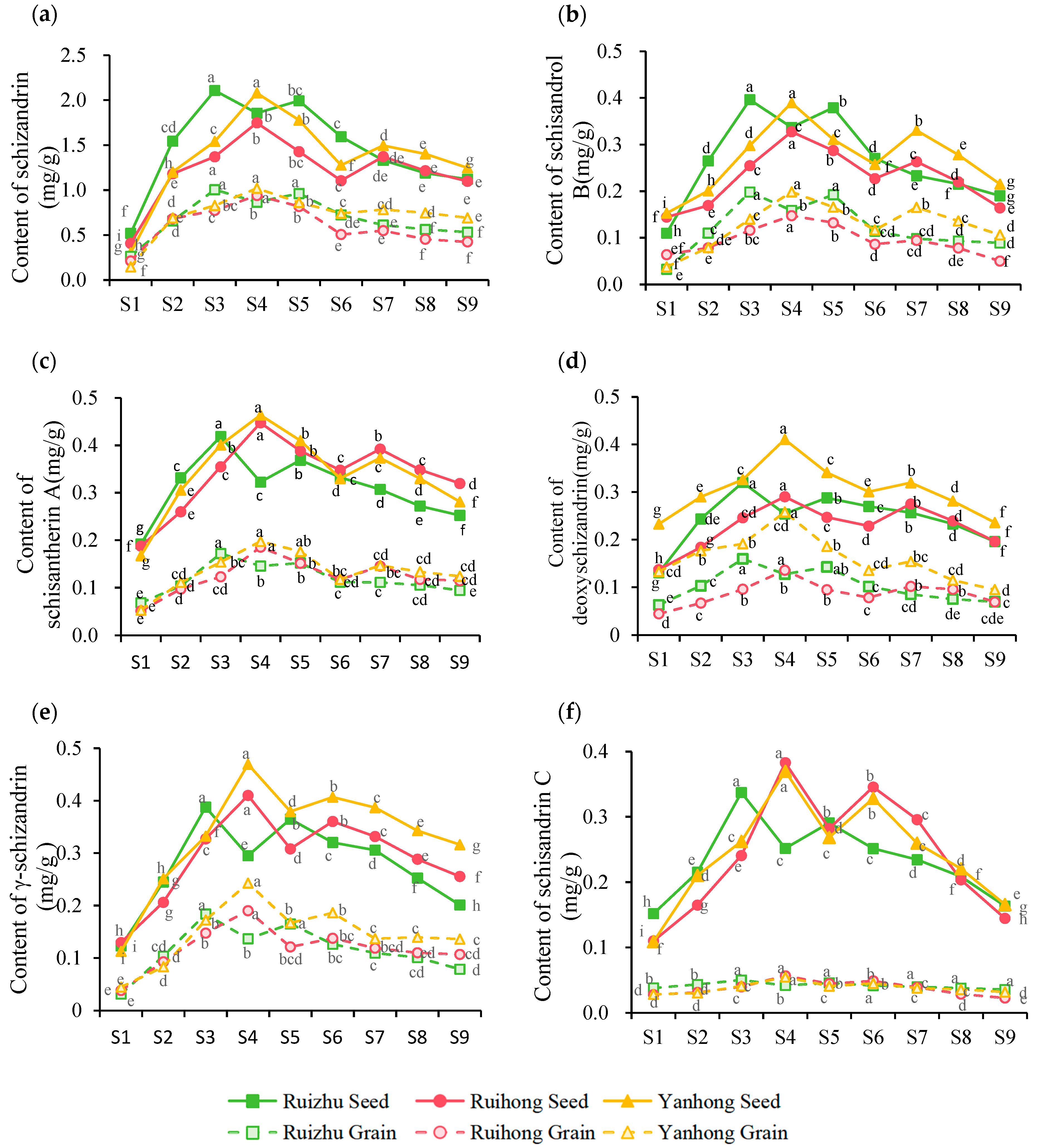 S. chinensis decreased with the progression of fruit ripening (S7–S9), and the contents of various lignans in the seeds also decreased to varying degrees. Shi et al. [