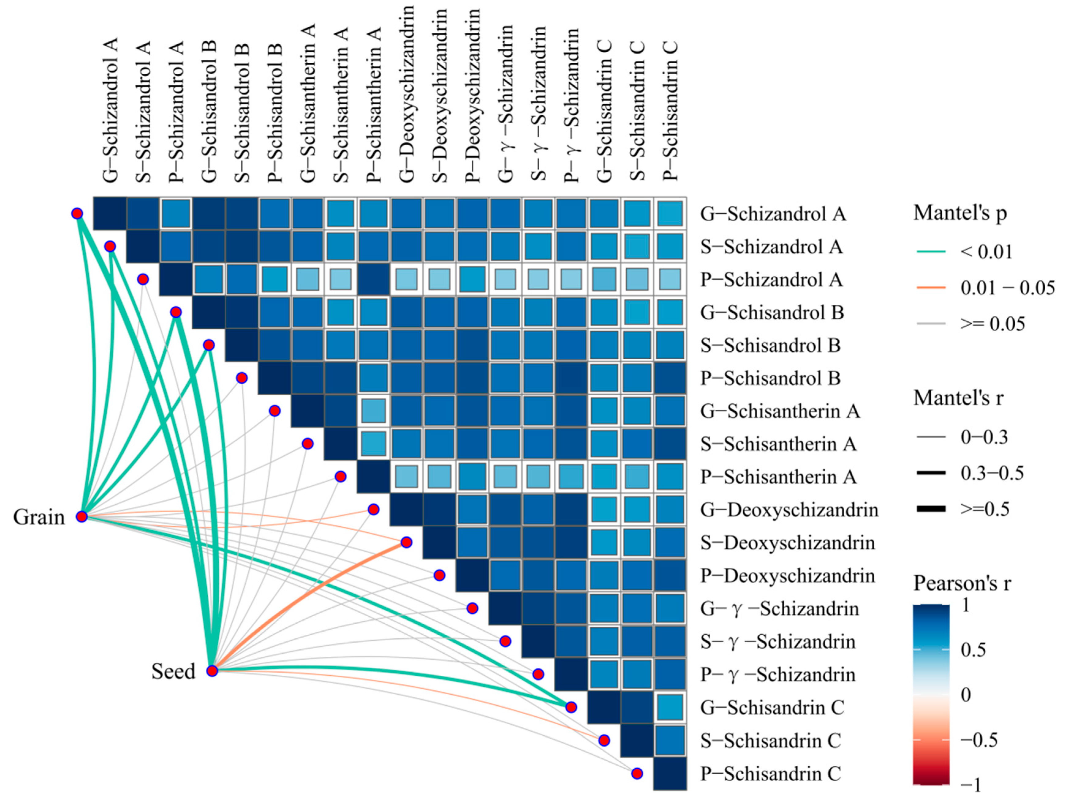 S. chinensis was carried out using RStudio 4.3.3. Additionally, a Mantel correlation analysis was performed to examine the relationship between lignans content and grain and seed size (