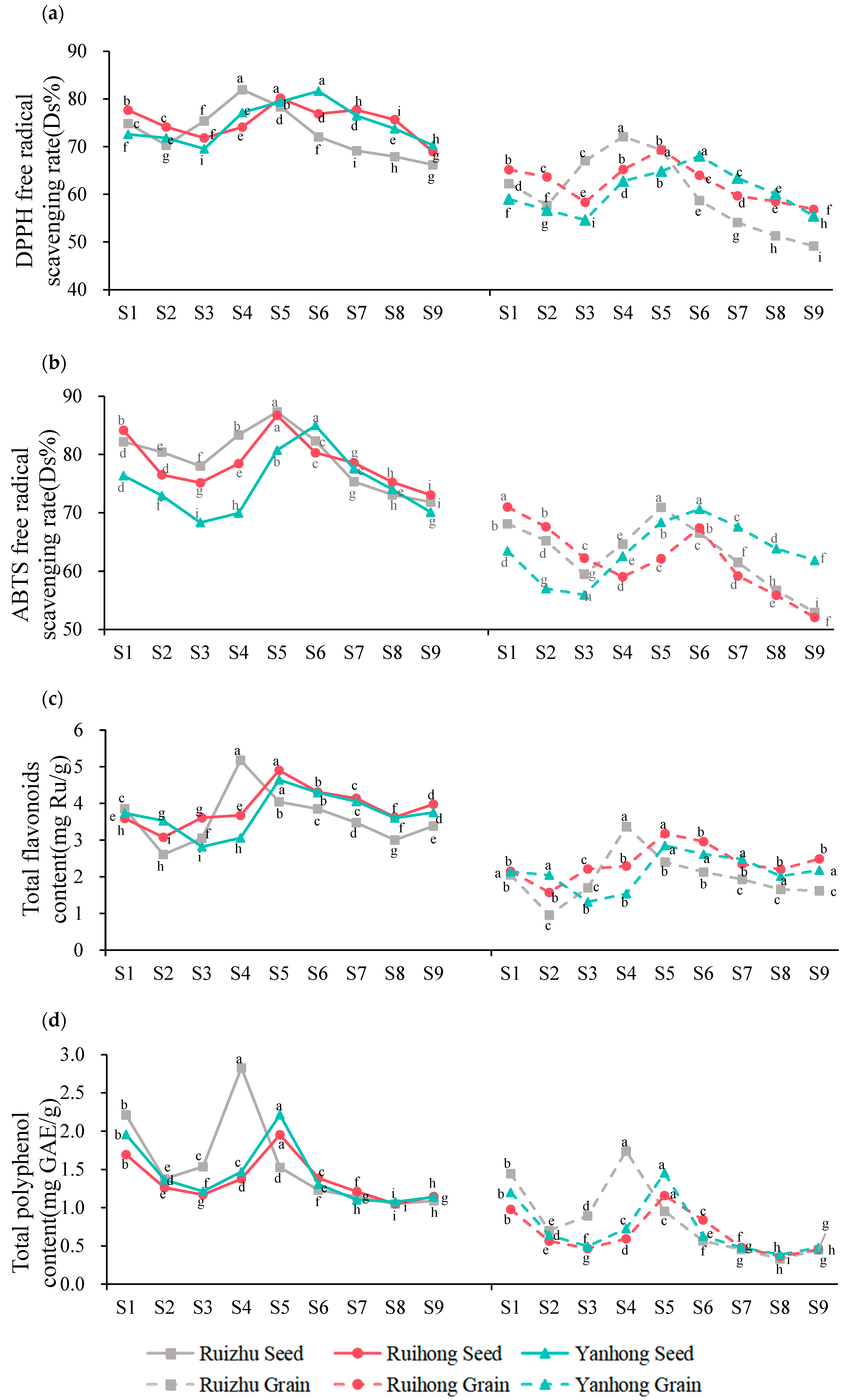 26]. The stage with the highest DPPH and ABTS free radical-scavenging ability in the seeds was largely consistent with that of the highest total flavonoids and total phenolic acid contents. The DPPH and ABTS free radical-scavenging ability at 70–80 days after flowering (S4–S5) was significantly higher than that at the mature stage. The TFC and TPC in the grains at different harvest stages were positively correlated with antioxidant activity (DPPH and ABTS free radical-scavenging ability). Therefore, harvest time is an important factor affecting the antioxidant activity of