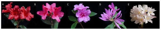 Hybridization parents. (A) R. hybrid ‘Red Tiara’; (B) R. hybrid ‘Fuchsia Parasol’; (C) R. hybrid ‘Carnation’; (D) R. hybrid ‘Pink Ribbons’; (E) R. moulmainense.