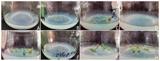 The germination and growth of hybrid seeds. (A) ‘Carnation’ × R. moulmainense; (B) ‘Red Tiara’ × R. moulmainense; (C) ‘Fuchsia Parasol’ × R. moulmainense; (D) ‘Pink Ribbons’ × R. moulmainense; (E) ‘Carnation’ × ‘Fuchsia Parasol’; (F) ‘Red Tiara’ × ‘Red Tiara’; (G) ‘Fuchsia Parasol’ × R. rivulare; (H) ‘Pink Ribbons’ × ‘Fuchsia Parasol’. The image in (F) shows growth after 30 d of aseptic seeding, and the rest of the images show growth after 100 d.