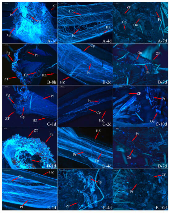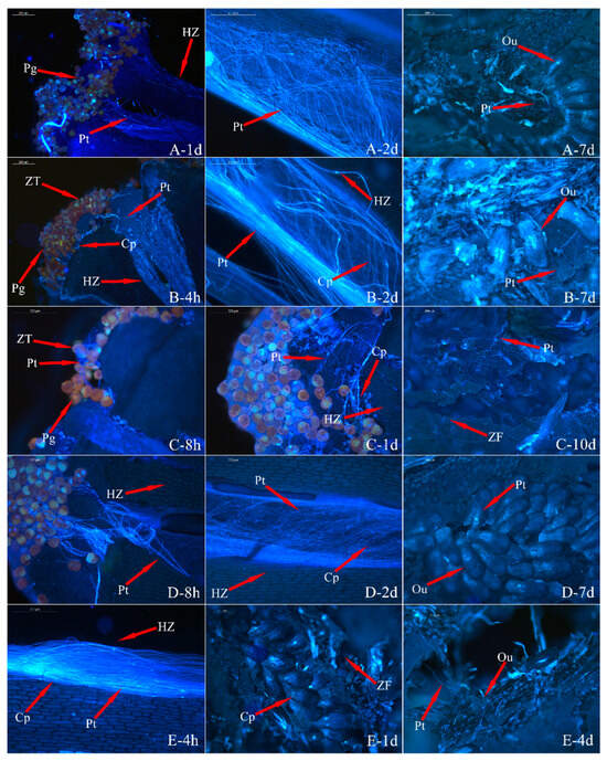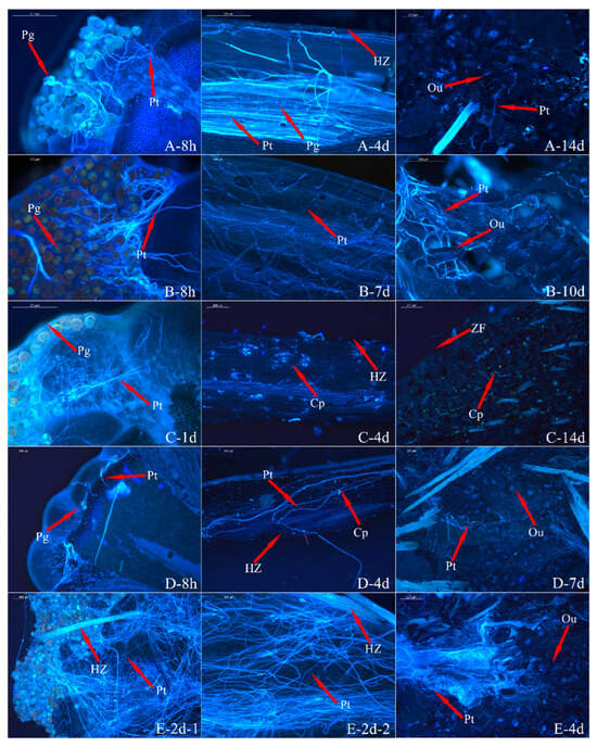 Fluorescence observations of ‘Pink Ribbons’ × R. moulmainense pollen tubes. Picture scale bar is 200 µm. (A) Conventional pollination method; (B) pollen pollination by heating; (C) early-pollination method; (D) delayed-pollination method; (E) repeat pollination method (Pg: pollen grain; Pt: pollen tube; Cp: callose; Ou: ovule; ZT: stigma; HZ: stylet; ZF: ovary).
