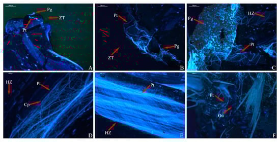Fluorescence observations of ‘Carnation’ × ‘Fuchsia Parasol’ pollen tubes. The picture scale bar is 200 μm. (A) A small number of pollen grains germinate; (B) a large number of pollen grains germinate; (C) pollen tubes enter the flower style; (D) there is a small amount of callose in the pollen tube; (E) pollen tubes grow to two-thirds of the style; (F) pollen tubes are in contact with the ovules (Pg: pollen grain; Pt: pollen tube; Cp: callose; Ou: ovule; ZT: stigma; HZ: stylet).