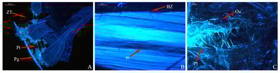 Fluorescence observations of ‘Red Tiara’× ‘Red Tiara’ pollen tubes. Picture scale bar is 200 µm. (A) Pollen grains begin to sprout in 4 h; (B) pollen tube bundles grow in 4 days; (C) pollen tubes are in contact with the ovules in 7 days (Pg: pollen grain; Pt: pollen tube; Ou: ovule; ZT: stigma; HZ: stylet).