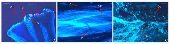 Fluorescence observations of ‘Pink Ribbons’ × ‘Fuchsia Parasol’ pollen tubes. Picture scale bar is 200 µm. (A) Pollen grains begin to sprout in 8 h; (B) pollen tube bundles grow in 4 days; (C) pollen tubes are in contact with the ovules in 7 days (Pg: pollen grain; Pt: pollen tube; Cp: callose; Ou: ovule; ZT: stigma; HZ: stylet).