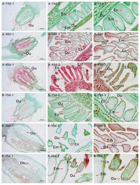 The ovary was observed in paraffin sections of ‘Carnation’ × R. moulmainense and ‘Carnation’ × ‘Fuchsia Parasol’. (A) ‘Carnation’ × R. moulmainense; (B) ‘Carnation’ × ‘Fuchsia Parasol’. The first column scale is 1000 µm; the second column scale is 100 µm; the third column scale is 50 µm (Ou: ovule; Em: embryo; En: endosperm).