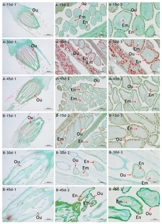 At 15 days following pollination of ‘Red Tiara’ × R. moulmainense, the ovules were arranged in an orderly manner and exhibited regular morphology, with embryos and endosperm clearly observable in some ovules (Figure 10A-15d). At 30 days post-pollination, the ovules developed normally, forming spherical embryos with distinct structures; however, a minor proportion of embryos and endosperm showed uncoordinated development (Figure 10A-30d). At 45 days following pollination, the morphology of some ovules became irregular, and a limited number of embryos initiated abnormal degradation (Figure 10A-45d). In the case of ‘Red Tiara’ × ‘Red Tiara’, the ovules were orderly arranged and developed normally 15 days after pollination (Figure 10B-15d); by 30 days post-pollination, the ovules had developed into typical spherical embryos (Figure 10B-30d); and at 45 days post-pollination, the embryos gradually matured, with only a few ovules exhibiting abnormal development (Figure 10B-45d).