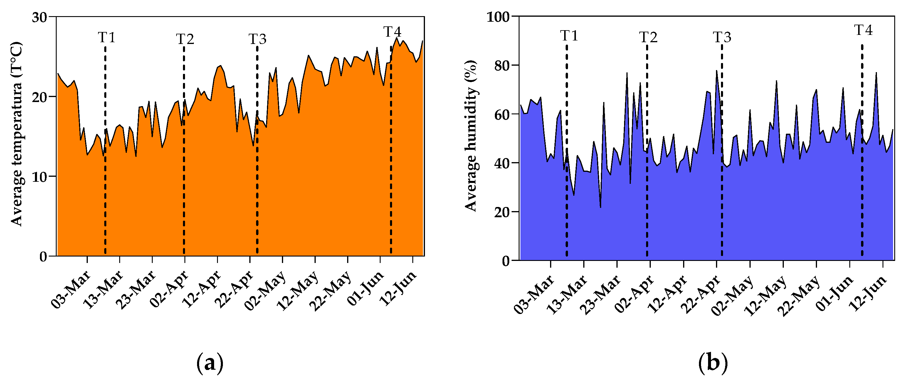 2.2. Greenhouse Parameters, Treatment Identification, and Fruit Biometric Measurements