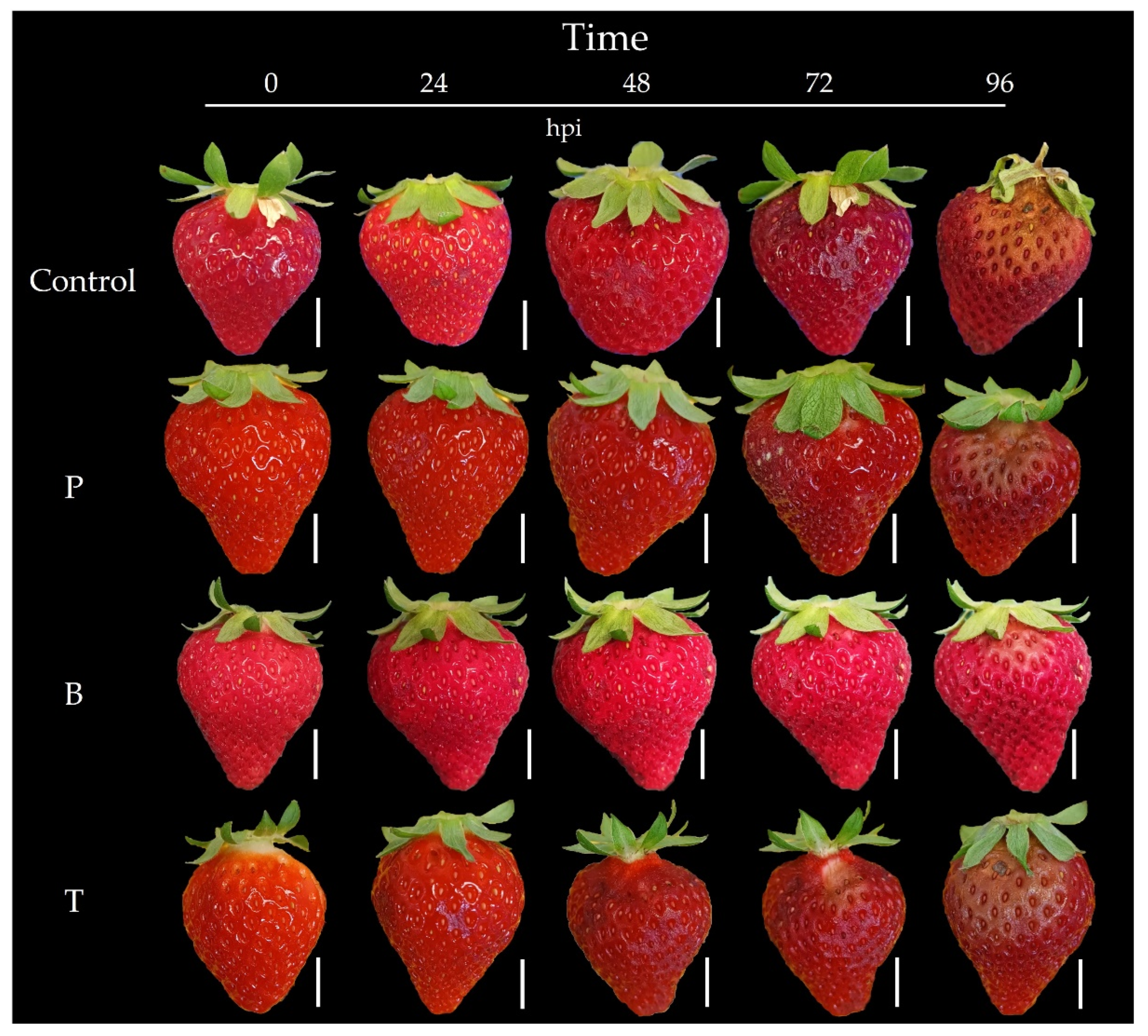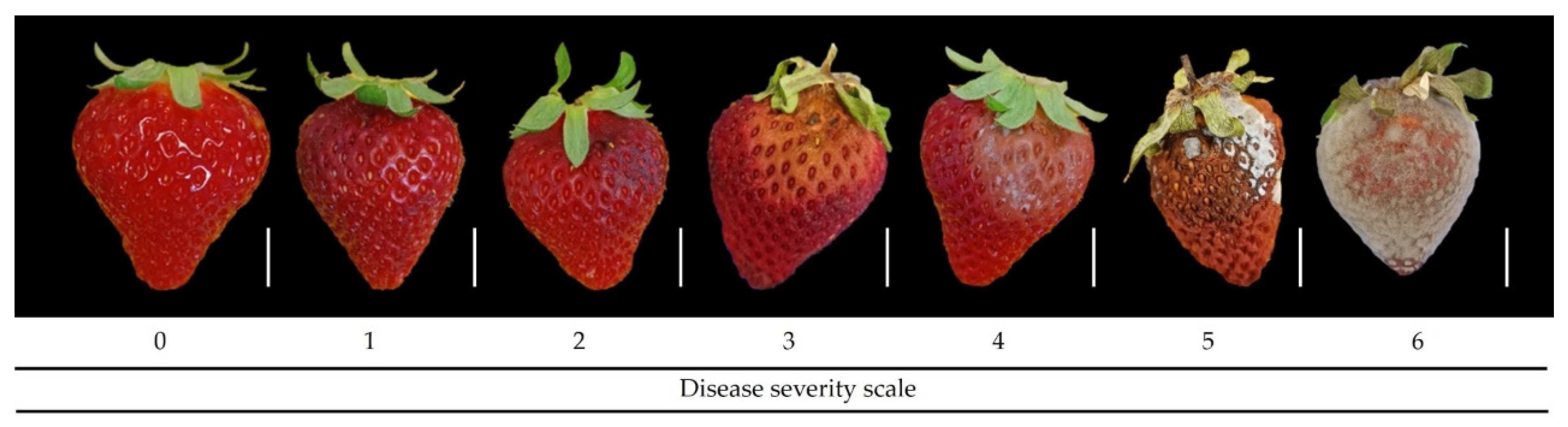 2.9. Botrytis cinerea Inoculum Preparation and Fruit Inoculation
