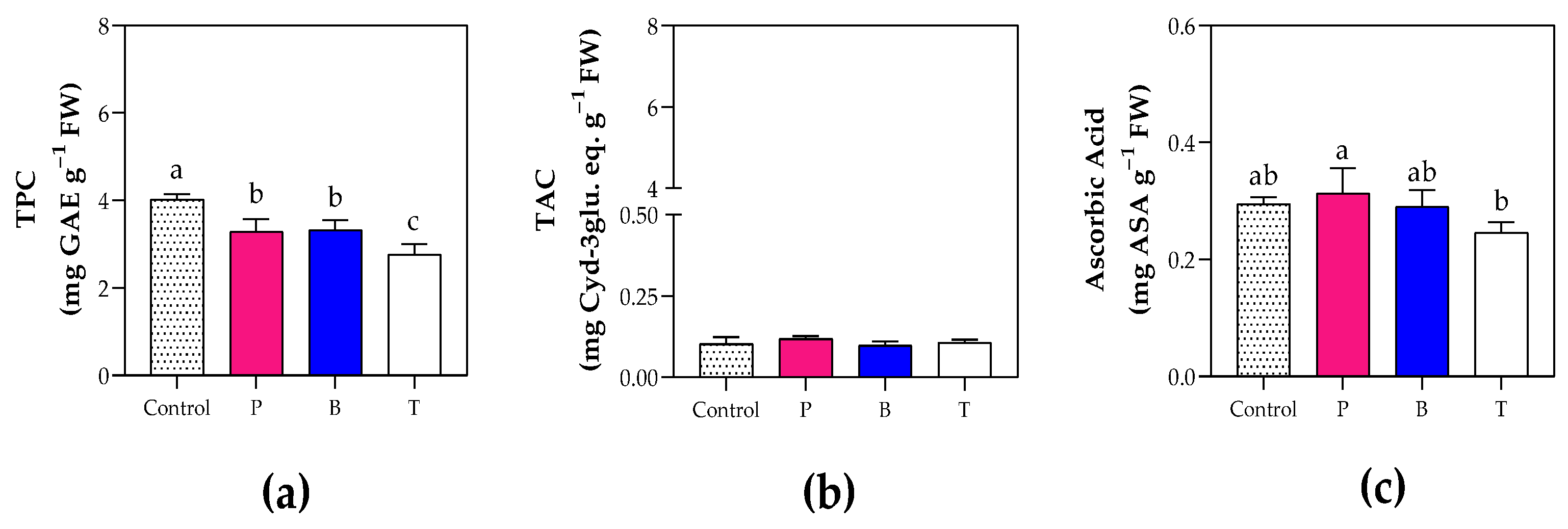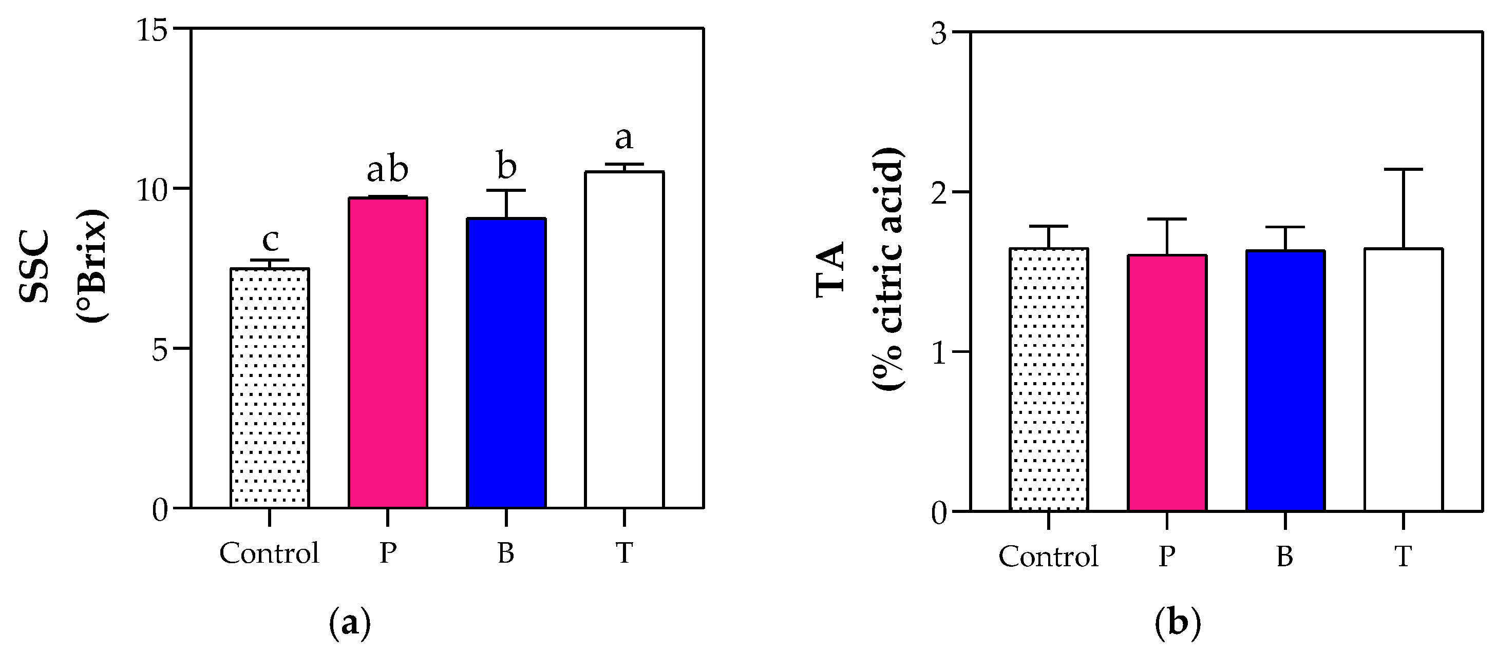 2.5. Fruit Color, Soluble Solid Content and Titratable Acidity