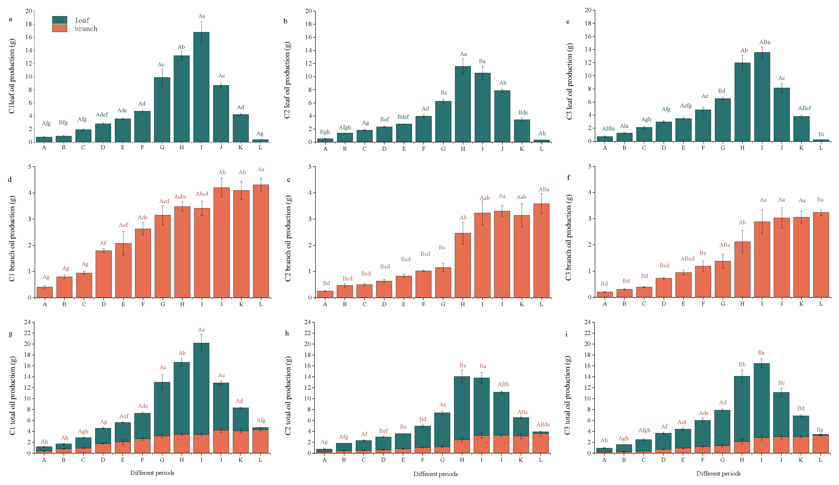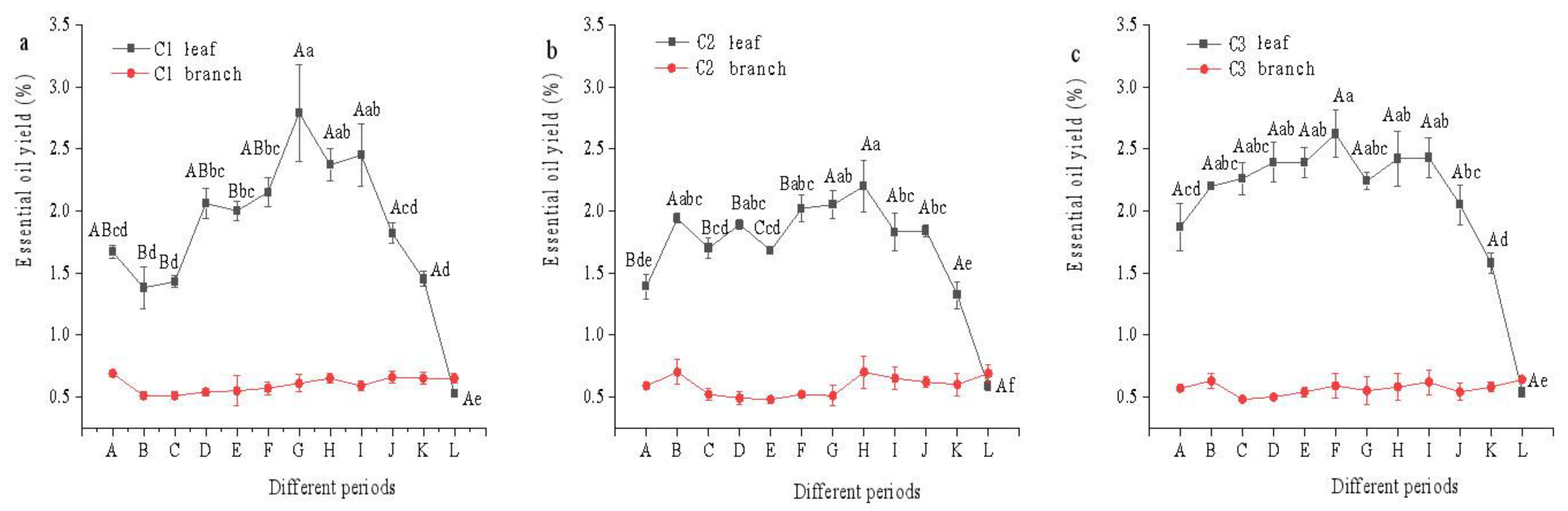 4.1. Differences in Biomass and Essential Oil Yield at Different Periods