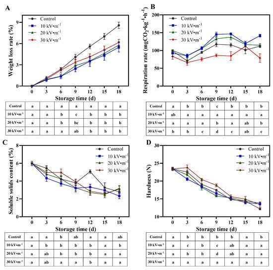 As shown in Figure 2A, with the extension of storage time, the weight loss rate of all groups exhibited a linear upward trend; however, treatment with HVEF delayed the increase in weight loss rate. The respiration intensity across all groups generally followed a pattern of initial increase followed by decrease (Figure 2B). The respiration peaks for the control, 10, 20, and 30 kV m−1 treatment groups appeared on days 9, 12, 12, and 15, respectively, indicated that the 30 kV m−1 treatment delayed the onset of respiratory peaks. Furthermore, on days 6, 9, 12, and 18, the respiration rates of the 30 kV m−1 group were significantly lower than those of the other groups, demonstrating that the 30 kV HVEF treatment effectively suppressed the respiratory activity of A. bisporus. As illustrated in Figure 2C, the soluble solids content across all groups exhibited an overall decreasing trend, with no significant differences observed between groups at different time (p < 0.05), indicated that HVEF treatment does not induce changes in the flavor profile of A. bisporus. The hardness of all groups generally declines with increasing storage duration (Figure 2D). Notably, the groups treated at 30 kV m−1 on days 3, 6, and 9 maintain higher hardness levels compared to other groups, suggested that 30 kV m−1 treatment effectively preserved the hardness of A. bisporus during the early storage period.