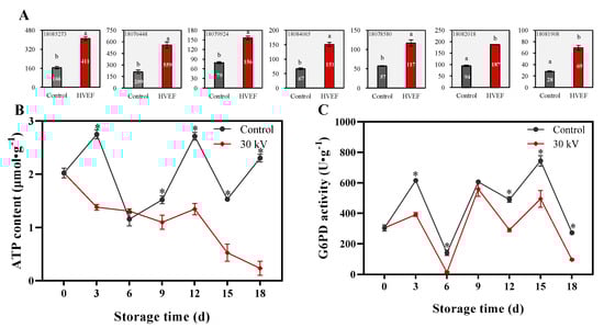 In Figure 4A, treatment with 30 kV m−1 HVEF significantly activated the expression of ATPase-related genes, indicated there was a reduction in ATP content. As illustrated in Figure 4B, overall, except on day 6, the ATP levels in the 30 kV m−1 HVEF treatment group remained significantly lower than those in the control group. The greatest difference was observed on day 18, with ATP content in the 30 kV m−1 HVEF group being 2.07 μmol g−1 lower than the control. As shown in Figure 4C, throughout the storage, except on day 9, the G6PD activity in the 30 kV m−1 HVEF group was consistently lower than that in the control; on days 3, 6, 12, 15, and 18, enzyme activity in the treatment group was reduced by 222.9 U g−1, 128.6 U g−1, 199.33 U g−1, 248.62 U g−1, and 176.7 U g−1 respectively compared to the control.