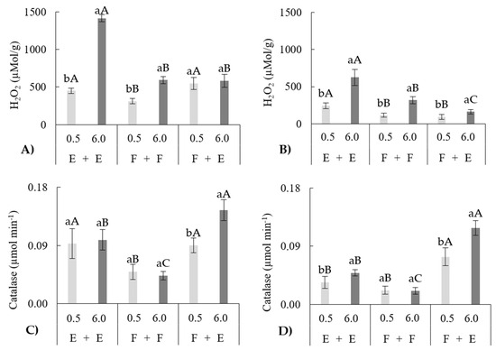 The evaluation of the activity of catalase in the roots revealed that at 0.5 dS m−1, the F + F and E + E combinations did not differ from each other but had lower averages than the F + E combinations, with values in the order of 70.3 and 50%, respectively. For an S2, the F + E combinations presented the highest average, which was 240.8% greater than that of the E + E combinations and 561.9% greater than that of the F + F combinations. In addition, only the F + F combinations presented no difference between the different ECs tested. On the other hand, when exposed to S2, E + E and F + E resulted in increases of 44.1 and 59.4%, respectively, in catalase activity compared with that resulting from S1 (Figure 1D). The catalase activity in the roots was significantly lower than that in the leaves, with a reduction of 38.7% (Figure 1C,D).