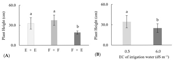 For this variable, there was no interaction between the sources of variation tested. However, there was an isolated effect of the different combinations of species, where E + E and F + F were statistically equal to each other. However, both were significantly superior to F + E, with increases of 13.7 and 18.5 cm in plants height, respectively (Figure 3A). Concerning the performance of the plants in the face of salinity, there was a significant reduction of 9.6 cm when they were exposed to irrigation water of 6.0 dS m−1 compared with those irrigated with 0.5 dSm−1 (Figure 3B).