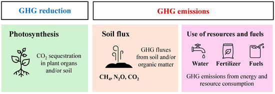 In floriculture and landscape sectors, it is important to evaluate whether the production and use of plants contribute to CO2 reduction [8]. Life cycle assessment (LCA) methodologies provide insights into the greenhouse gas (GHG) emissions associated with horticultural production. Many studies have quantified GHG emissions from energy and resource use, emphasizing the need to reduce environmental impacts [9,10,11]. However, to determine whether landscape plant production serves as a GHG sink or source, all major components of the GHG budget must be quantified (Figure 1). Ingram [12,13] and Hall [14,15] identified three key components of the GHG budget for horticultural plant production, demonstrating that tree and shrub production and use can function as GHG sinks. There are also comparative studies on plant carbon fixation and soil fluxes in woody plant production [16,17,18]. Kuronuma et al. [19] further suggested that turf production fields may act as sinks for approximately 20–30 t-CO2e (CO2 equivalents)/ha. Nonetheless, comprehensive assessments of GHG emissions based on actual measurements are limited. Thus, it remains unclear whether landscape plant production is a GHG sink or source.
