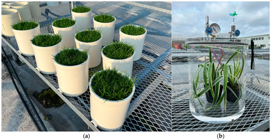 On 6 October 2023, to replicate the general soil cultivation method, 0.3 g of Kentucky bluegrass ‘Moonlight SLT’ (TAKII & Co., Ltd (Kyoto-city, Japan)) seed was sown in a Wagener pot (φ159 × 190 mm, 0.02 m2), filled with 2 L of soil (1.7 L andosol and 0.3 L compost) (Table S1). A total of 10 pots were prepared and maintained in open fields (Kashiwa, Chiba, Japan) (Figure 2a). On 26 May 2024, the cultivation was terminated, and six pots were randomly selected for harvest. Turf was cut with 20 mm-thick soil layers and separated into plant and soil components. Harvested plant material was dried at 80 °C for 72 h and weighed. Carbon concentrations in the seeds and harvested plants were analyzed using a 2400 Series II CHNS/O analyzer (PerkinElmer, USA) (n = 6). Carbon sequestration from turfgrass growth (via photosynthesis) was calculated by subtracting the carbon content of the seeds per pot from that of the harvested plants. Results were converted to CO2e (carbon sequestration multiplied by 44 and divided by 12) and scaled to a per-hectare basis. Grass was mowed when its height exceeded 60 mm.