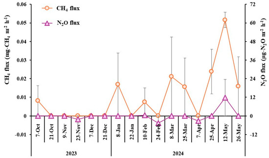 GHG fluxes were monitored approximately every two weeks during the cultivation period (6 October 2023, to 26 May 2024) using a closed-chamber method [20]. Gas samples were collected from three pots per sampling period between 8:00 and 15:00. Sampling occurred at 0, 10, and 20 min intervals, and the CO2, CH4, and N2O concentrations were analyzed using a gas chromatograph (GC-2014, Shimadzu, Kyoto, Japan). GHG fluxes and CH4 and N2O emissions during the experimental period were calculated according to closed-chamber guidelines [20]. CO2 fluxes over the experimental period were not calculated because gas sampling was limited to daylight hours, and CO2 sequestration was evaluated by converting the carbon sequestration of plant biomass.