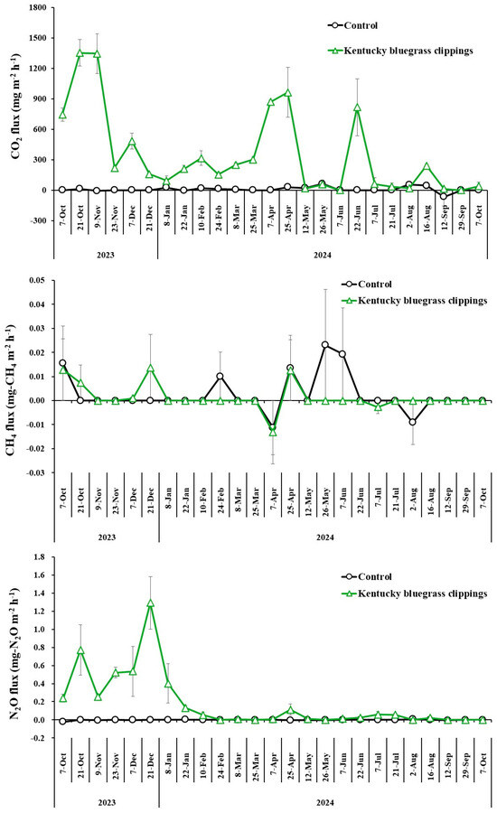 This study also quantified annual GHG fluxes and carbon sequestration from grass clippings handled on site (leaving them as is). This is because a large amount of grass clippings is generated in the production of sod, and it is generally disposed of by leaving it as is. To assess the overall GHG budget in the production field more accurately, it is necessary to include the GHG flux during the disposal phase of grass clippings. On 6 October 2023, 50 g dry weight (DW) of Kentucky bluegrass clippings was placed in a Wagener pot (φ159 × 190 mm) filled with 1 L of andosol. A control treatment using only 1 L of soil was also prepared. Five replicates were used per treatment for each experiment. All pots were kept outdoors in open fields (Kashiwa, Chiba, Japan). GHG fluxes were monitored every two weeks for one year using the same closed-chamber method (n = 3). Gas sampling and analysis followed the procedure described above. Annual emissions of CO2, CH4, and N2O were calculated by subtracting emissions from the control from those in the grass clipping treatment. Carbon content in the grass clippings was measured at the beginning (6 October 2023) and end of the experiment (7 October 2024) using the 2400 Series II CHNS/O Analyzer (PerkinElmer, USA) (n = 5).