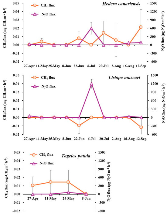 CH4 and N2O fluxes from the potting production of the three herbaceous plants during the cultivation period.