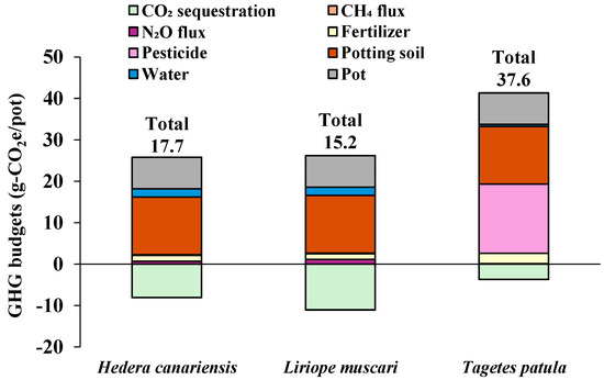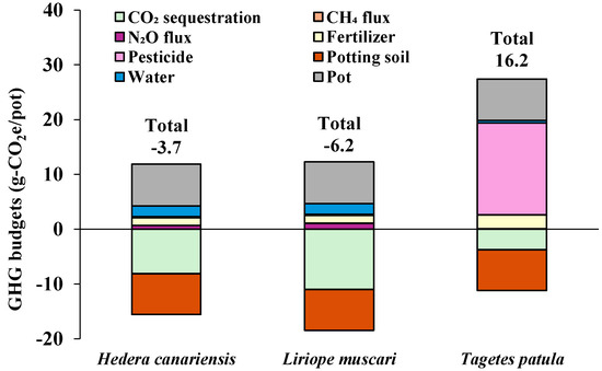 The GHG budgets and their components are summarized in Figure 6. Total GHG budgets were 17.7 g-CO2e/pot for Hedera canariensis, 15.2 g-CO2e/pot for Liriope muscari, and 37.6 g-CO2e/pot for Tagetes patula. These results indicate that the potting production of all three herbaceous plants was a net GHG source. Among the GHG budget components, soil fluxes (CH4 and N2O fluxes) and GHG emissions from the use of fertilizer and water had a minor impact on total values (Figure 6). In contrast, GHG emissions from the use of granular pesticides, potting soil, and polypropylene pots were major contributors (Figure 6 and Table 5).