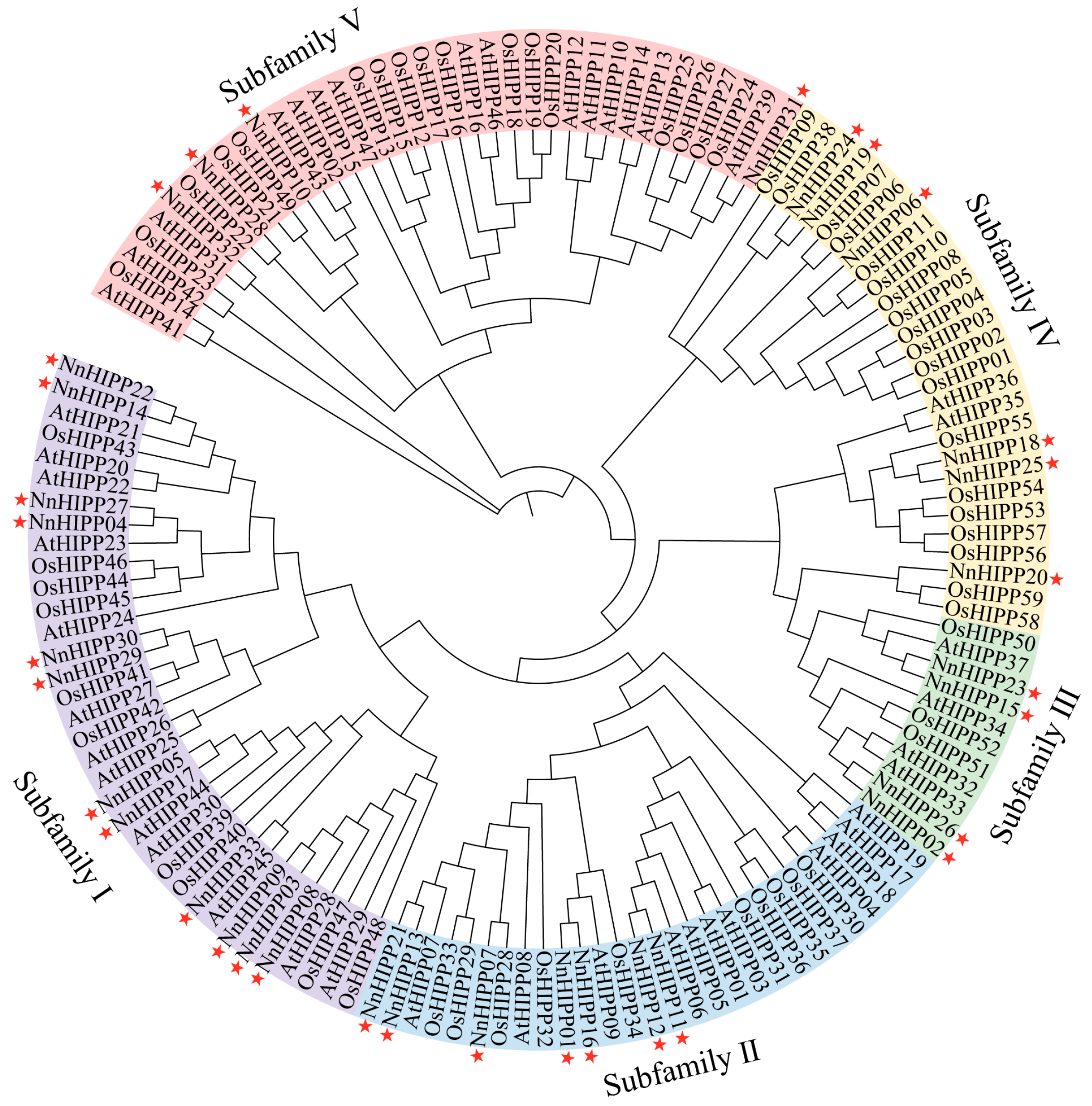 3.2. Protein Domains and Phylogenetic Analysis of NnHIPP Proteins