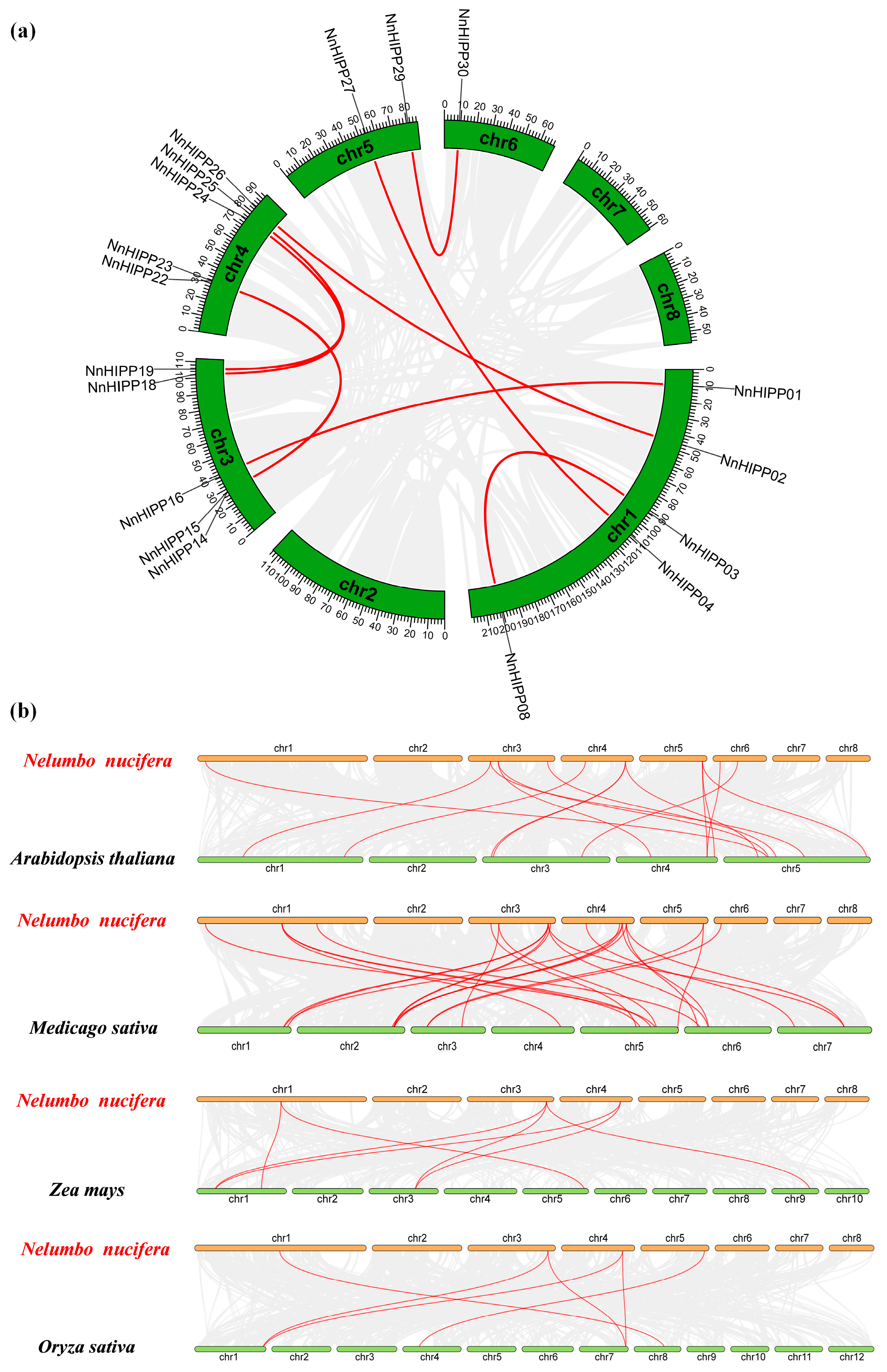 2.5. Chromosome Distribution and Synteny Analysis in NnHIPP Gene Family