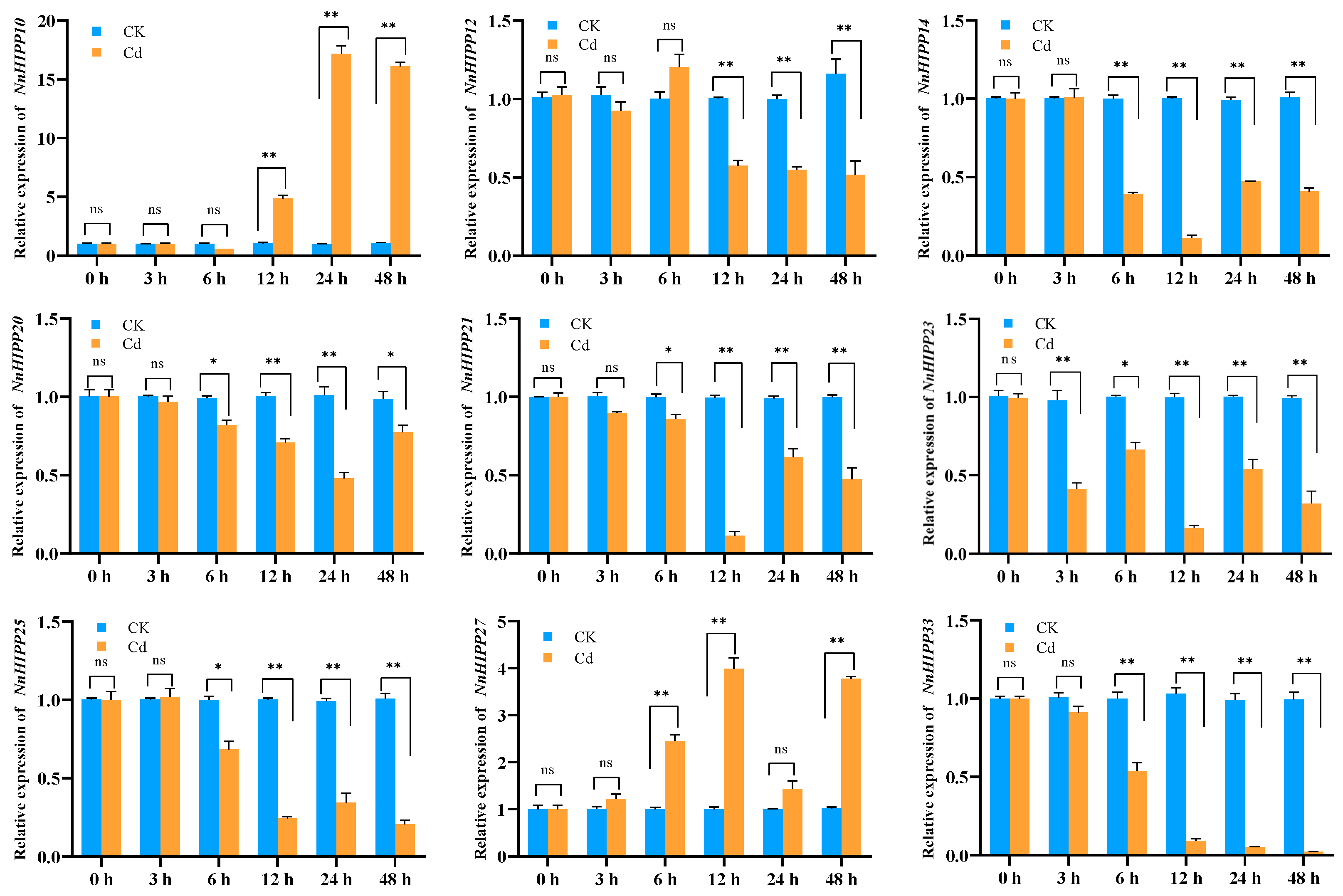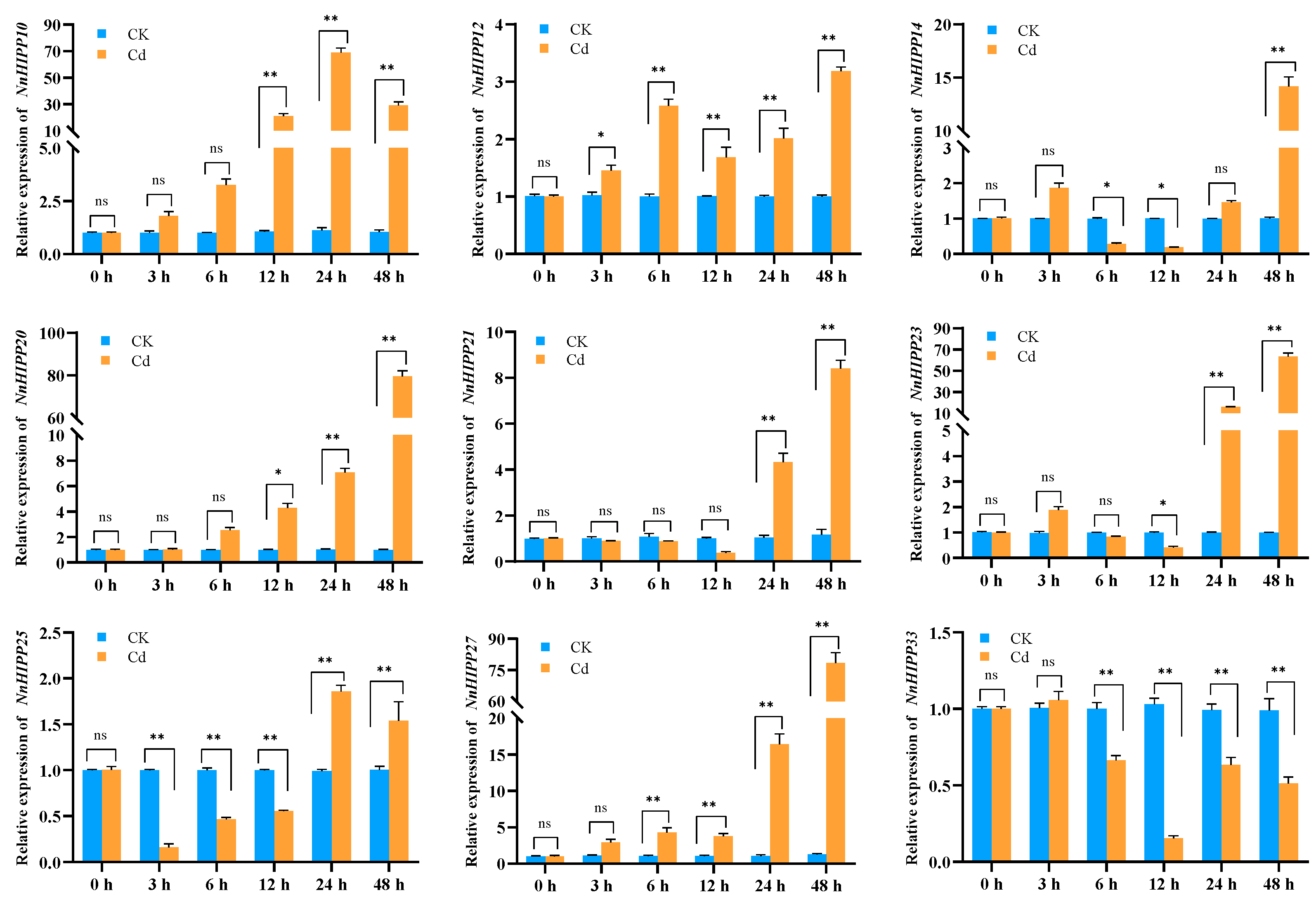 3.6. Expression Levels of NnHIPP Genes in Lotus Under Cd Stress