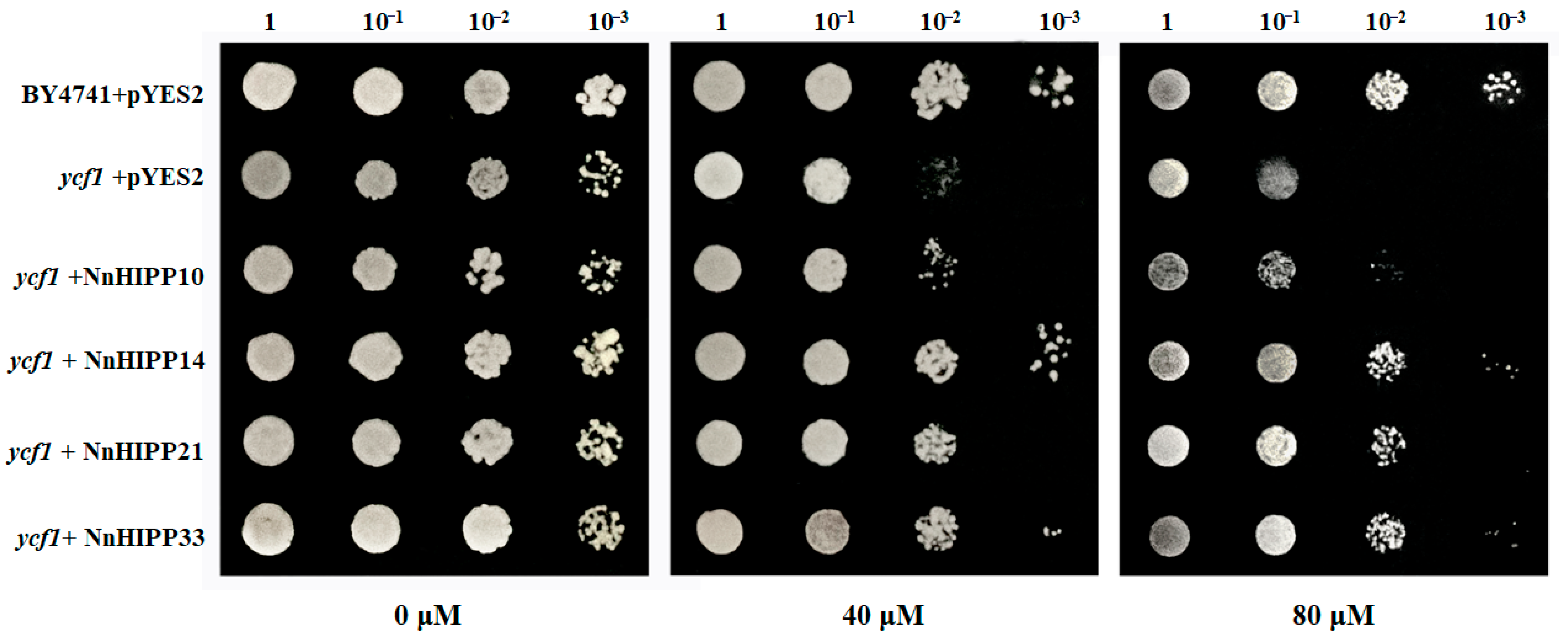 3.8. The Function of NnHIPPs on Cd Tolerance in Yeast