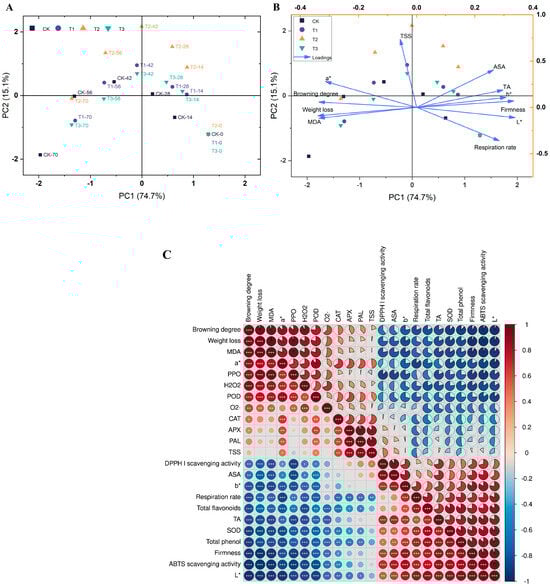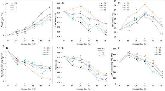 3.2. Weight Loss, TA, TSS Content, Respiration Rate, Firmness, ASA Content