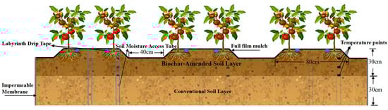 Soil microbial diversity and community structure have been identified as significant indicators of soil health [6,7], and are also critical for maintaining soil fertility and sustainable production [8]. Soil microbial ecosystems are dominated by fungi and bacteria, and the increase in soil microbial activity in mulched drip irrigation is mainly due to the improvement of the soil water, air, and thermal environments. However, residual film residues may also lead to a decrease in soil microbial activity [9]. Meanwhile, disparate irrigation conditions yield divergent effects on soil microorganisms. It has been demonstrated that soil bacterial community diversity increases as the relative soil water content increases within a certain range [10], while fungi are more resistant to water [11]. However, excessively high soil moisture conditions can also lead to a decrease in soil microbial diversity [12]. Reduced soil moisture can alter soil microbial community composition and diversity [13]; but it may only change bacterial community structure without affecting diversity [14]. Biochar application exerts variable effects on soil microorganisms, ranging from positive to negative or even none. It is a commonly held belief that the application of biochar exerts a direct influence on the physical and chemical properties of the soil, which in turn affects the associated properties of soil microorganisms [15,16]. Biochar is characterised by a high porosity, a substantial surface area, and a rich content of surface functional groups, which collectively foster the survival, colonization, and proliferation of microorganisms [17]. However, the presence of organic compounds, such as furan and phenol, in biochar may also act as an inhibitor to microorganisms, thereby resulting in a proportional decrease in microbial community with increasing biochar application [18]. Nevertheless, it has also been found that long-term application of biochar alone maintains the stability of the microbial community and exerts minimal effect on microbial activity [19]. The divergent conclusions may be attributed to factors such as the type of crop species, biochar application rate, water supply, and other alterations of the soil environment [20,21,22].