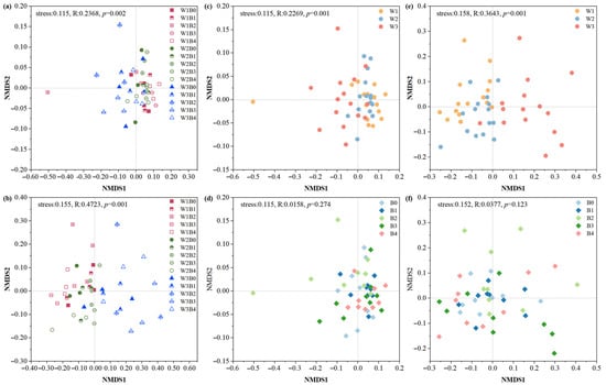 A significant variation in the soil bacterial Chao index was identified between treatments at the biochar level or water-biochar interactions, but not at the irrigation level. At the W1 and W2 levels, soil bacterial Chao index exhibited a comparable trend of decline and subsequent increase with the augmentation of biochar application, and the W1B2 treatment was the only statistically different to W1B0. Although W2B4 was the highest average, it was not statistically different from W2B0. The Chao index and Shannon index of soil fungi exhibited a highly significant divergence across treatments, exclusively at the irrigation level alone. The soil fungal Chao index of the treatments at the W2 level was observed to be at its maximum in comparison to the same biochar application rate (Table 1). NMDS analysis based on the Bray–Curtis distance demonstrated highly significant differences in the community structure of both soil bacteria (p = 0.002) and fungi (p = 0.001) across treatments, with samples from the same irrigation level exhibiting closer distribution (Figure 2a,b). Consequently, a further grouping of the diverse treatments was conducted into distinct irrigation levels versus biochar levels. The NMDS outcomes of these analyses revealed highly significant disparities (p = 0.001) in soil bacteria and fungi across treatments only at varying irrigation levels (Figure 2c–f).